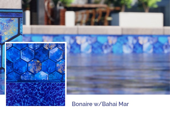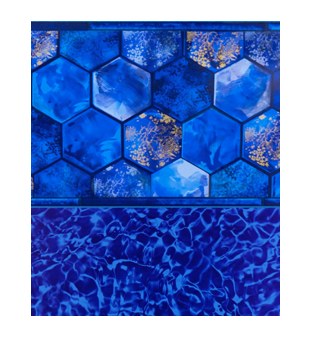 The striking hexagon border touched with shimmering gold accents, brings elegance and light to every pool. Combined with the flowing brilliant blue water floor design creates a radiant escape that feels both luxurious and inviting.